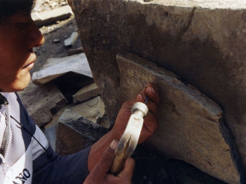 In use, this 6 words are commonly carved onto rocks or written on paper which is inserted into “Prayer Wheels”, which effects the same as reciting the mantra as many times as when an individual spins the wheel.