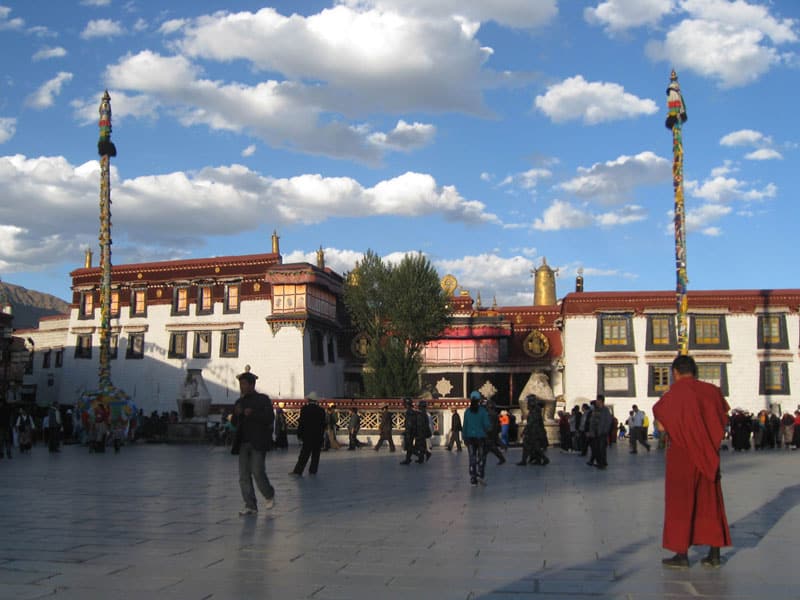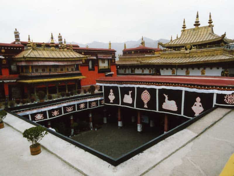 Jokhang Temple is considered the most sacred in Tibet, located at the center of Lhasa neighboring the old districts. It is 1,000 meters east of the Potala Palace. It was built by King Songtsen Gampo in 647 AD, and was found by Queen Bhrikuti on a site deemed by Queen Wen-Chen to be the principal Feng-Shui power-place in Tibet.