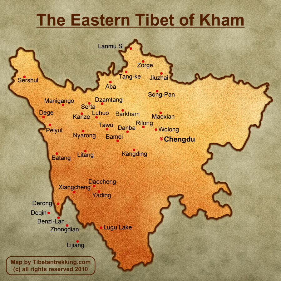 Kham, its scope is roughly equivalent to present-day Tibet Autonomous Region’s Chamdo City, eastern Nagqu city (five counties of Nyainrong, Baqen, Sog, Biru, and Lhari ); The eastern part of Nyingchi City (three counties of Zayu, Bome,and Medog), Yushu Tibetan Autonomous Prefecture of Qinghai Province, and Garze Tibetan Autonomous Prefecture & Aba Tibetan Qiang Autonomous Prefecture (parts), Muli Tibetan Autonomous County of Sichuan Province; Diqing Tibetan Autonomous Prefecture in Yunnan Province.